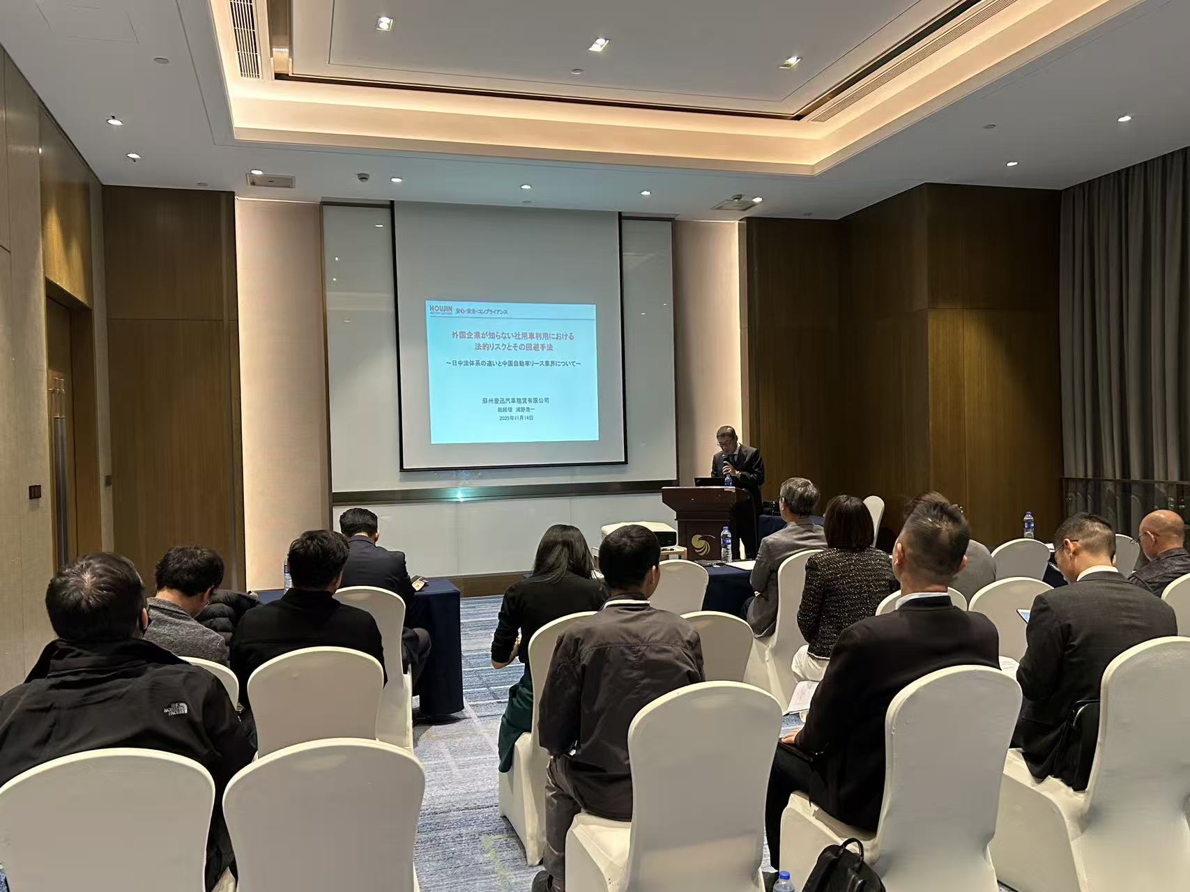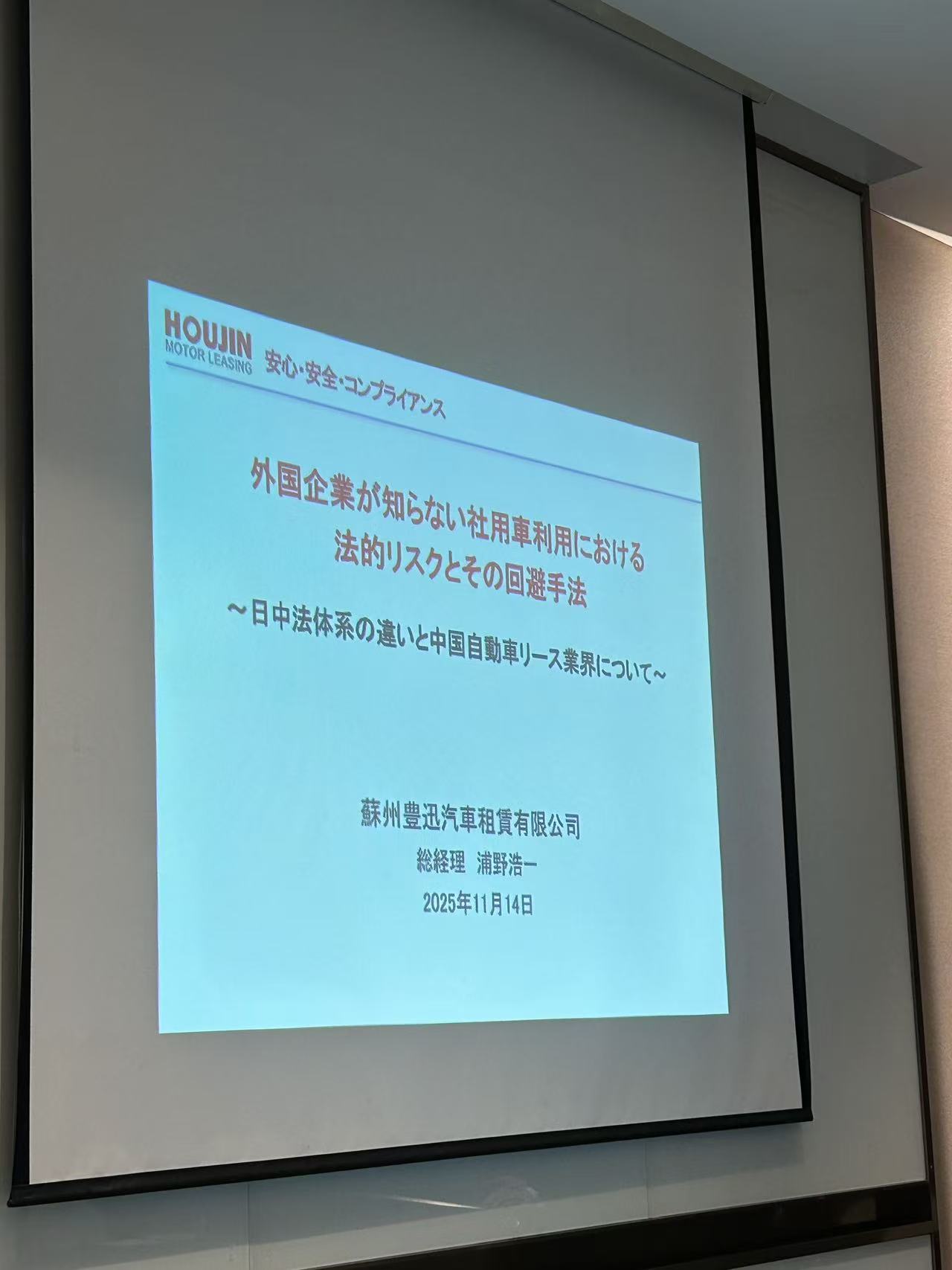 2025年11月14日昆山日商倶楽部主催、蘇州豊迅汽車租賃有限公司総経理 浦野 浩一様を講師にお招きし、外国企業が知らない社用車利用における法的リスクとその回避手法セミナーが開催されました。