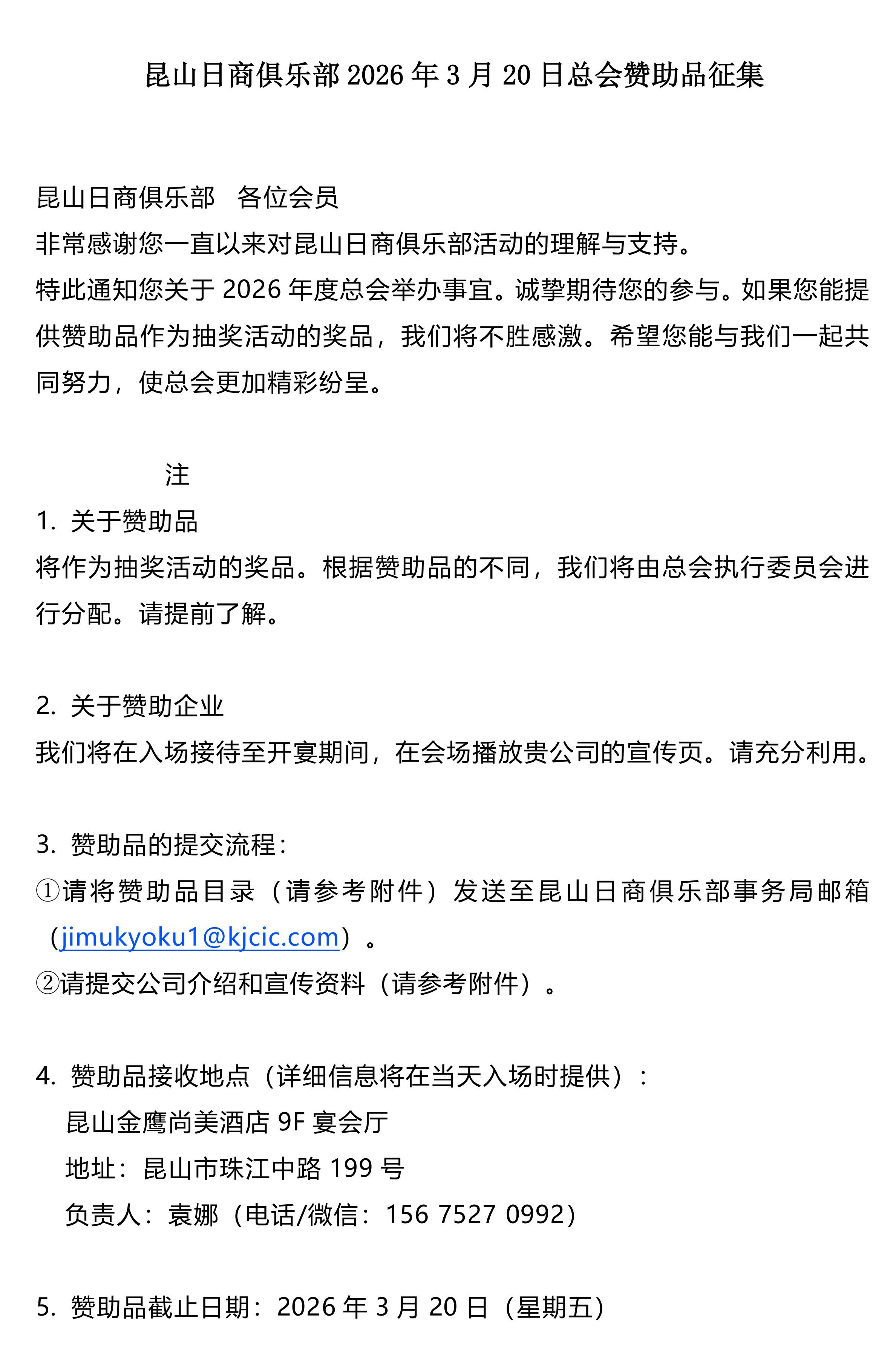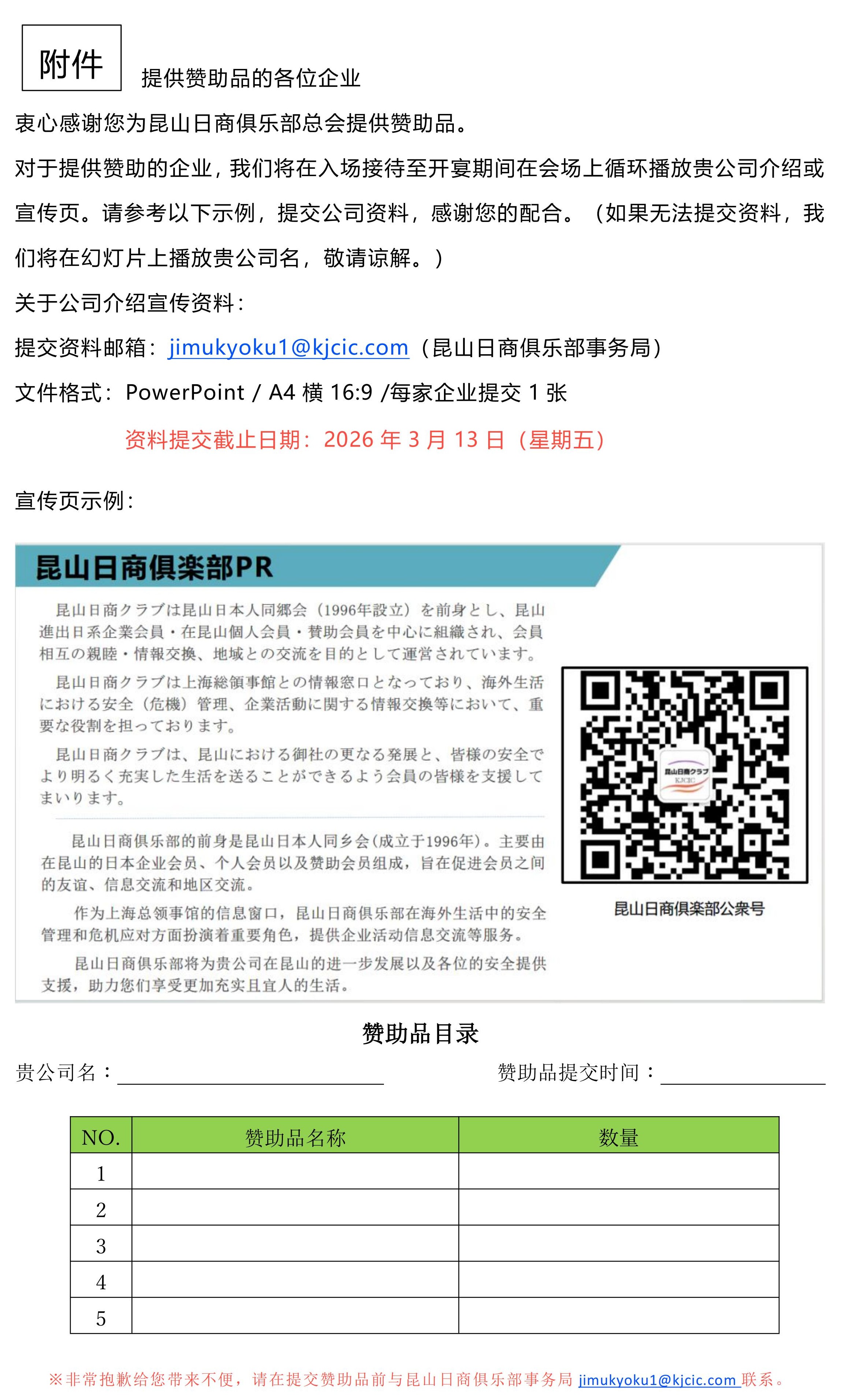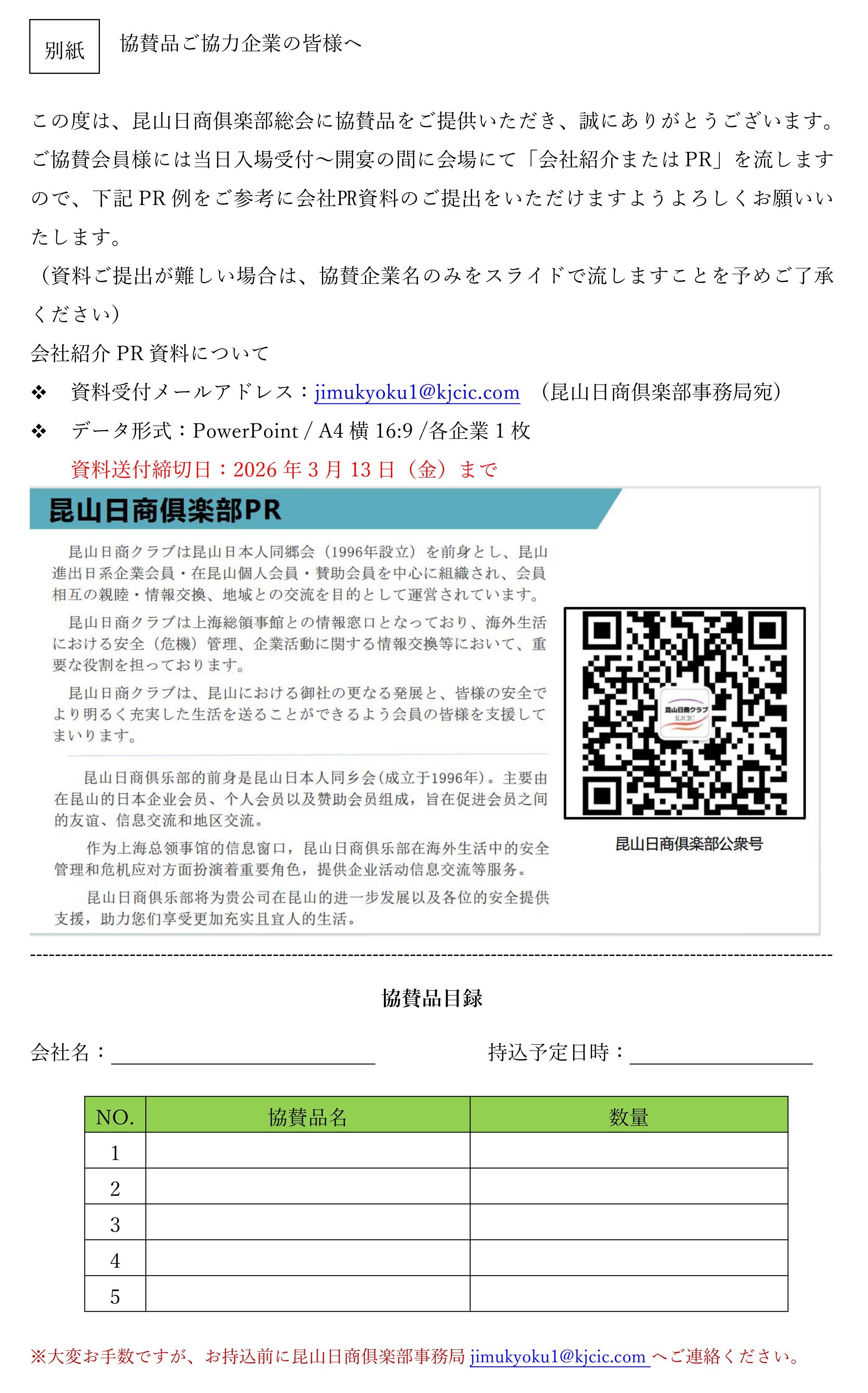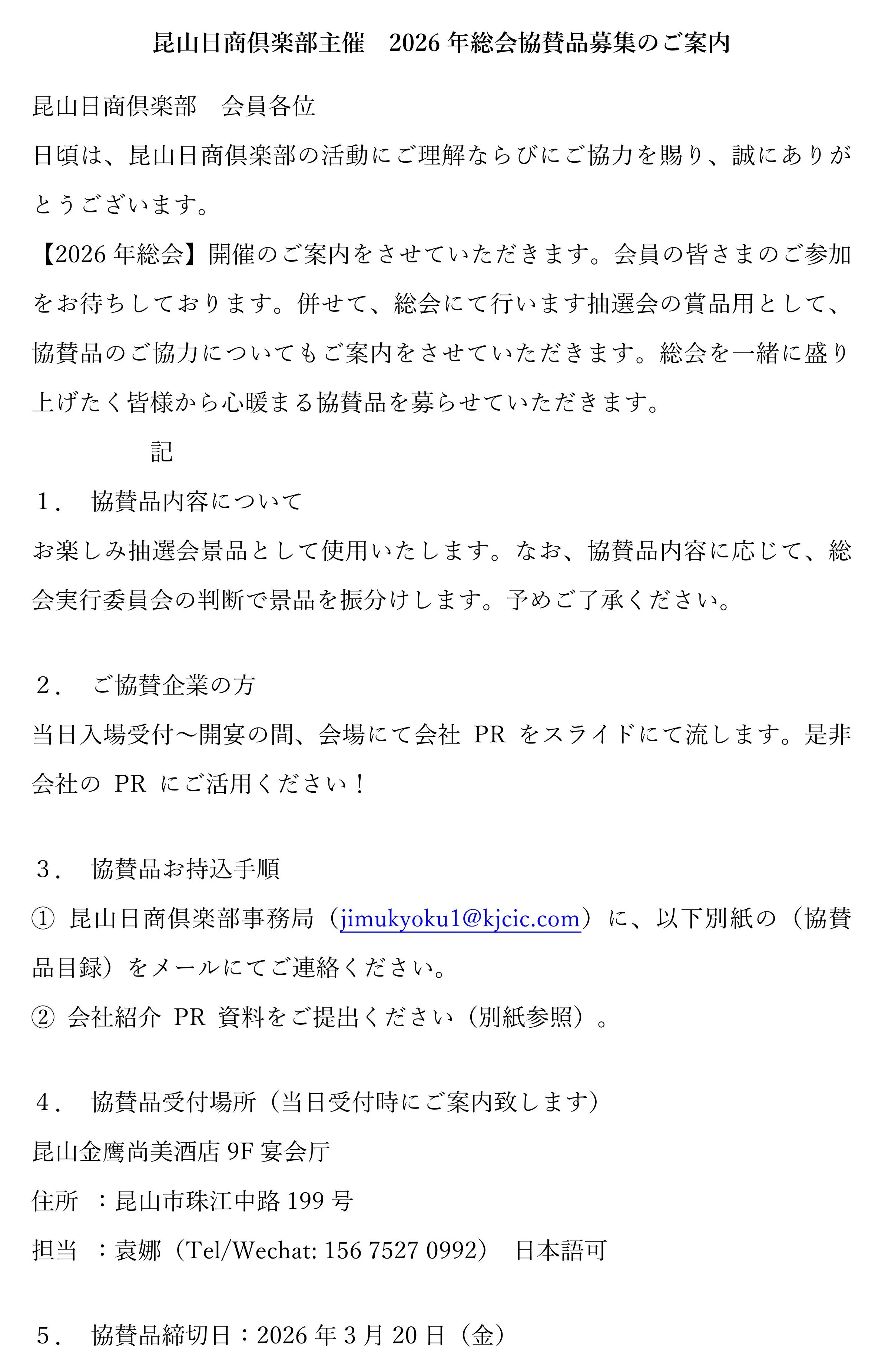 2026年3月20日 昆山日商倶楽部主催 総会協賛品募集のご案内